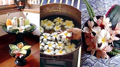 Next is a Lavender Body Wash followed by your choice of traditional Asian body scrub, to cleanse, soften and refresh your skin. A quick shower, and then (sink into a decadent Aromatherapy Floral Bath, available in Bali only) relax while you enjoy herbal tea and cookies. The pampering continues with a soothing Balinese Massage followed by your choice of Refresher Facial or Foot Massage.